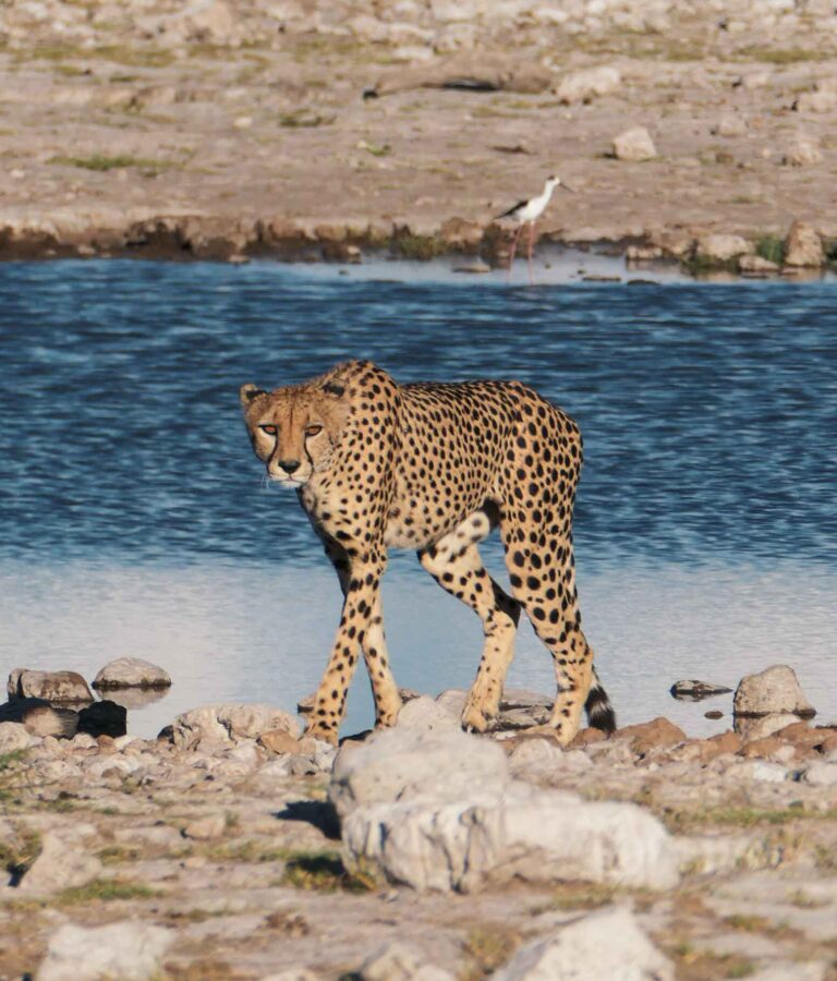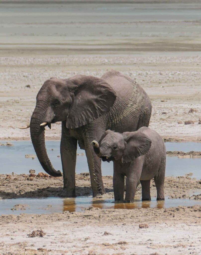 De rivier de Nata voedt de pan en creëert een vruchtbare delta waar pelikanen, flamingo’s en tientallen andere watervogelsoorten broeden. Als de omstandigheden goed zijn, zie je letterlijk duizenden flamingo’s tegelijk. Hun roze veren steken schitterend af tegen het witte zout en het blauwe water.